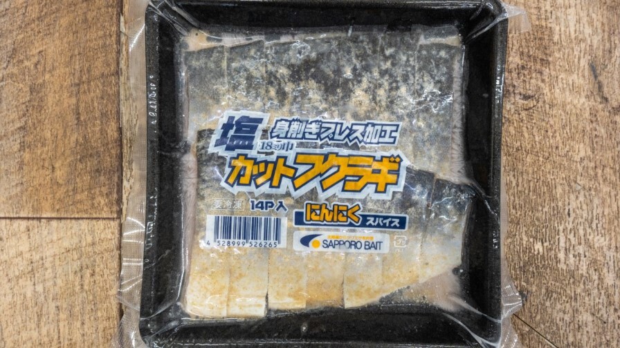 フクラギ(ブリの幼魚)もサケ釣りに使われます。メリットは皮が非常に硬く、ハリ持ちがよいこと。キャストを繰り返す釣りや、エサ取りが多い場面でも外れにくいのは大きな強みです。ただし匂いや食いのよさは、カツオやサンマに劣ります。そのため「食わせ能力よりもハリ持ちを優先したい」ときに選ばれるエサです。開きであれば投げ釣りに向きますし、カットタイプならウキルアーやウキフカセでも扱いやすいでしょう。