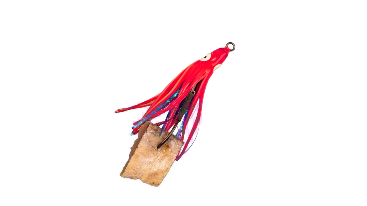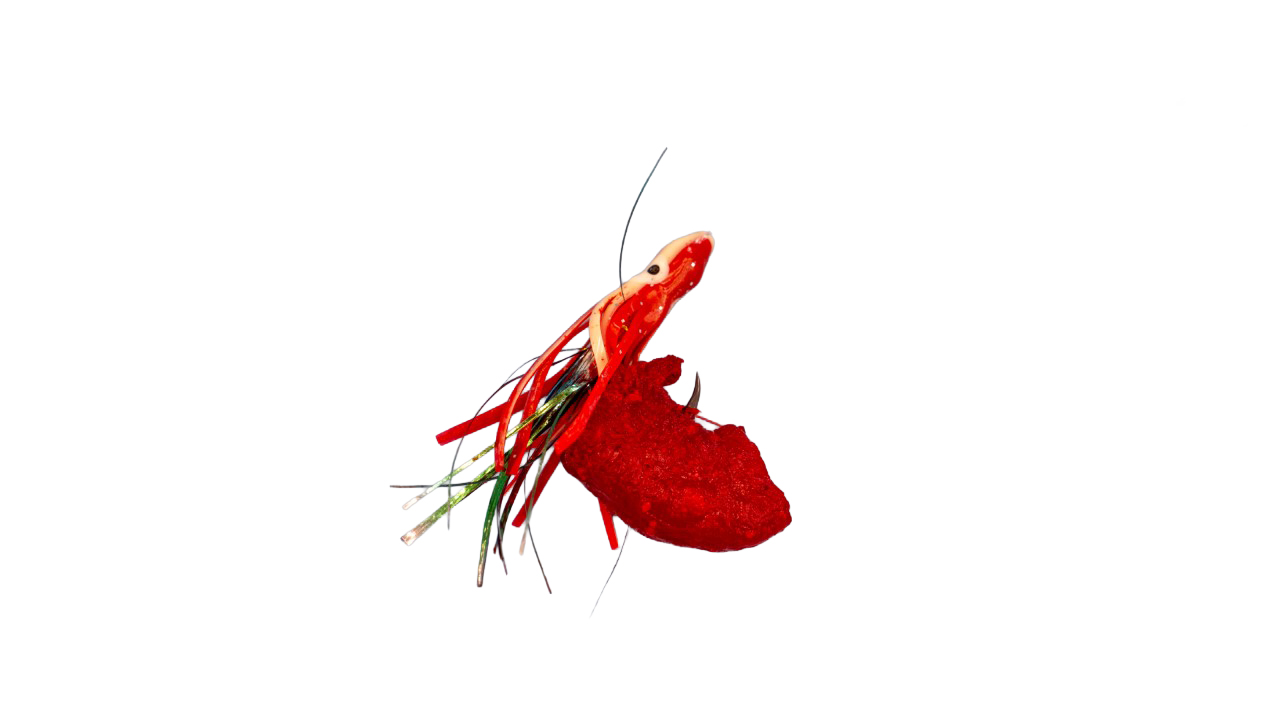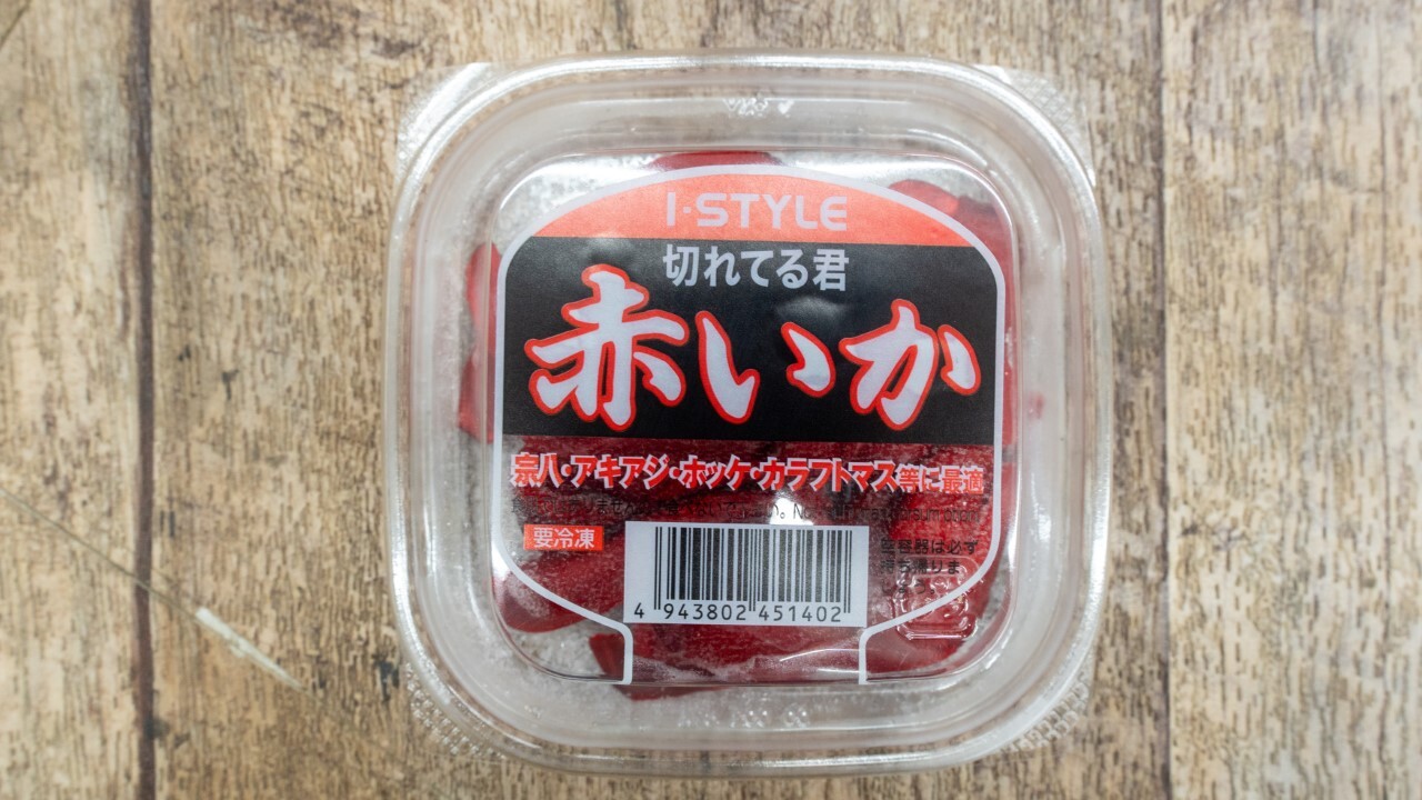 食品由来の赤色を着色した『赤いか』。視覚的なアピールをねらえるのもイカならではの強み。ウキルアー◎・ウキフカセ◯・投げ◯