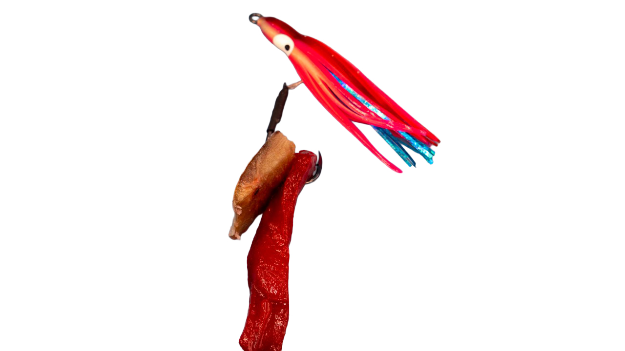 イカに関しては単体で用いられることは少なく、多くの場合はカツオやサンマとの抱き合わせで使います。繊維が強く、ハリから外れにくいのが最大の特徴です。よって「せっかく付けたエサがすぐに落ちてしまう」という状況を防いでくれます。種類もいくつかあり、食品由来の赤色を付けた『赤いか』、ニンニクの風味を利かせたもの、さらにラメをあしらったものなども。視覚的なアピールをねらえるのもイカならではです。