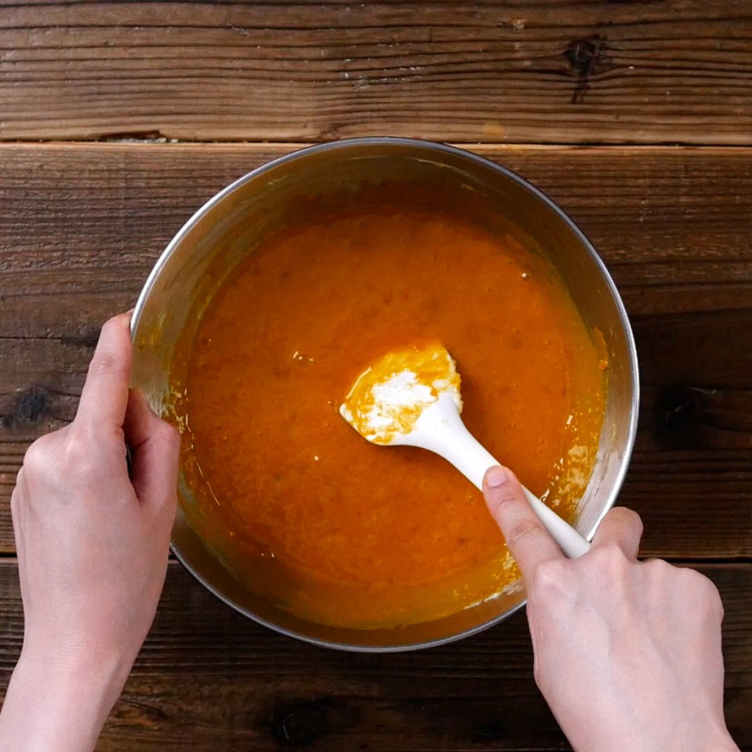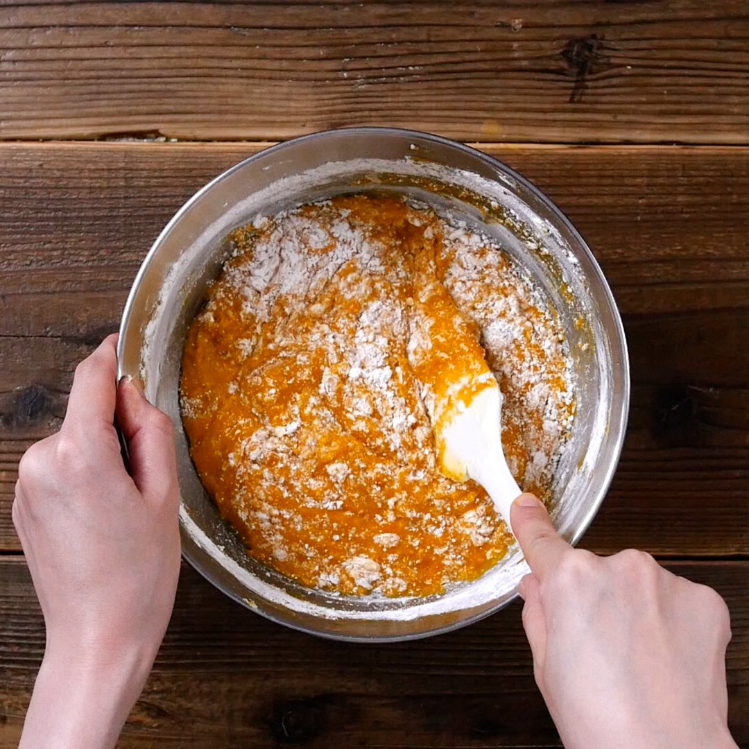 4: 砂糖、かぼちゃを加えてよく混ぜ合わせたら、卵を3〜4回に分けて加え、その都度よく混ぜます。