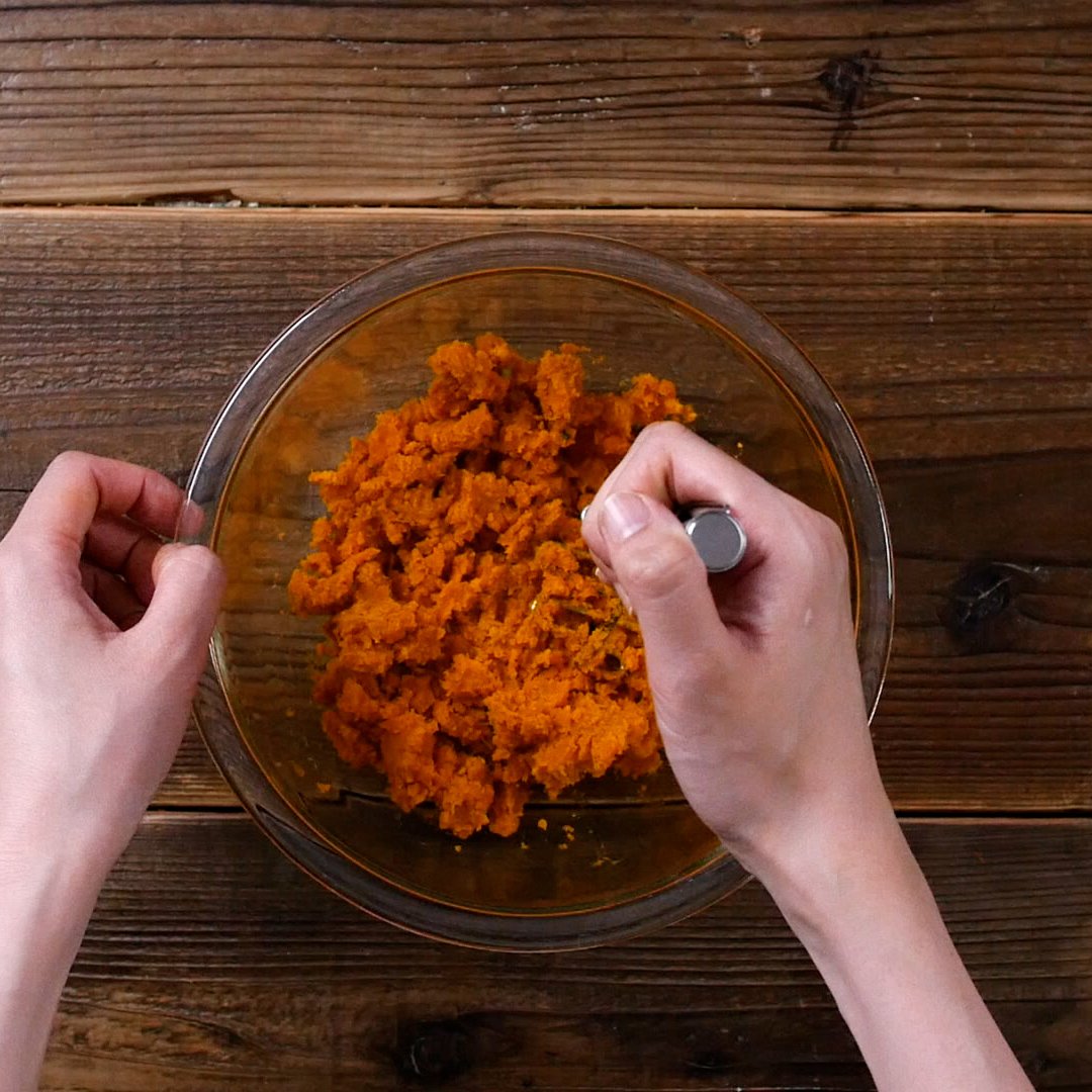 2: 取り出したら熱いうちにマッシャーで潰します。