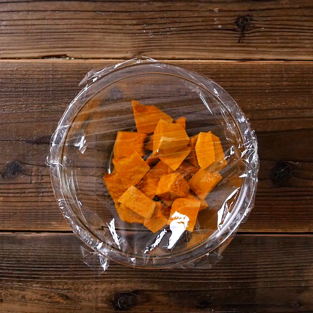 1: かぼちゃはひと口大に切り、ボウルに入れてふんわりラップをかけ、レンジ600Wで4分加熱します。