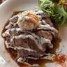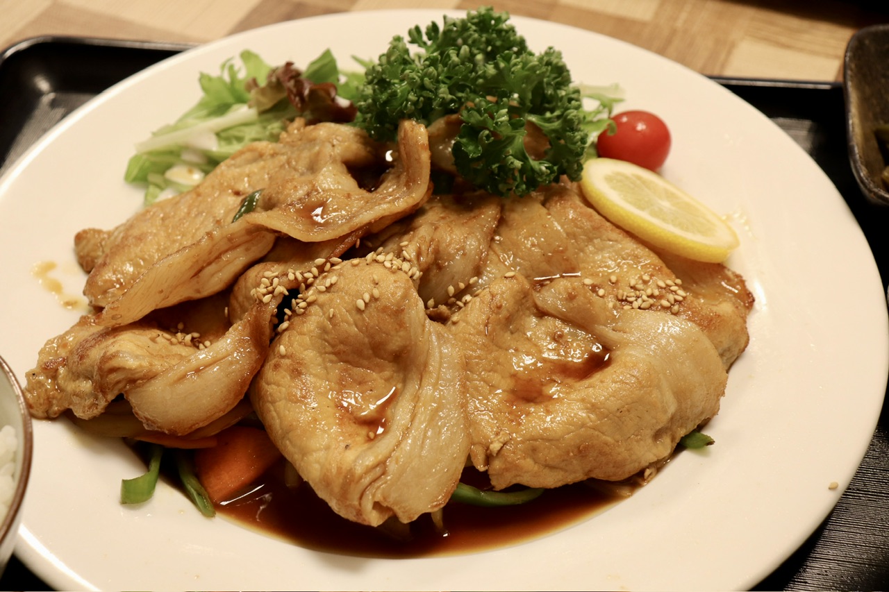 1枚でも大きなお肉が、5枚ものっています。豚肉は理想的な赤身と脂身のバランスで柔らかい!生姜の風味がほどよく、しっかりと甘辛く味付けされたタレがさらに食欲をそそりますね。万人に愛される、まさにお手本のような生姜焼きです!