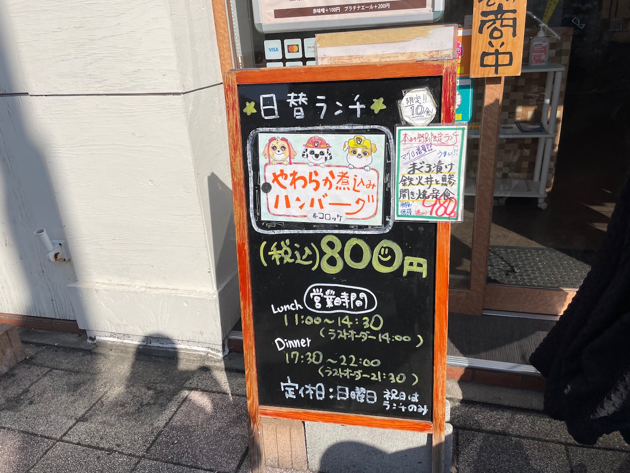 入り口には日替わりランチの看板がありました。ハンバーグとコロッケのランチが税込み800円とは、かなりのお値打ち価格なのではないでしょうか!?