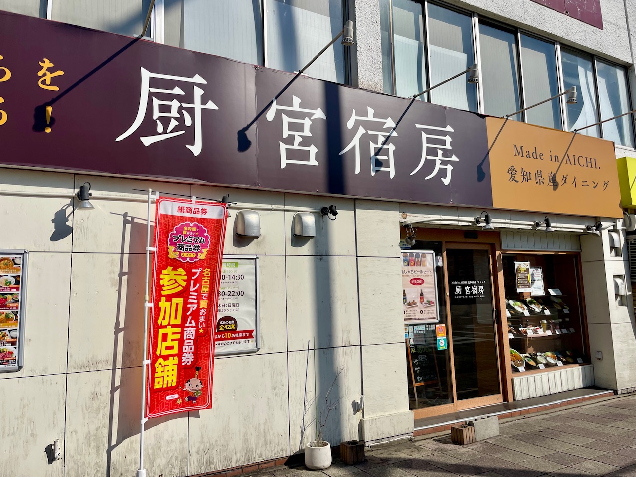 大きな看板が交差点からも目立つ外観の「厨 宮宿房」さんです。“愛知県産ダイニング”の文字が気になりますよね。