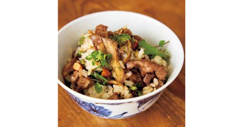 牛肉とまいたけのうまみたっぷりの甘辛味に、さんしょうがふわっと香る極上の混ぜご飯です。