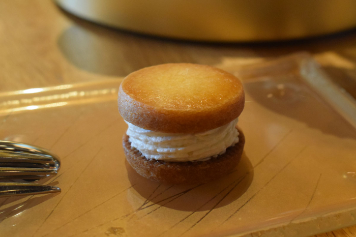 白鶴バターサンドは、発酵バターを使用したクッキーに白鶴の酒粕のバタークリームをサンドしたもの。クッキーはツヤツヤです。
