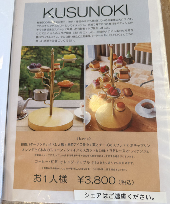 神戸市の都市公園で唯一の日本庭園『相楽園』。その敷地内にある「THE SORAKUEN」内のカフェ『相楽園パーラー』(神戸市中央区)で、おひとり様から注文できる予約不要のアフタヌーンティー「KUSUNOKI 秋麗」が始まったと聞き、取材に伺いました。