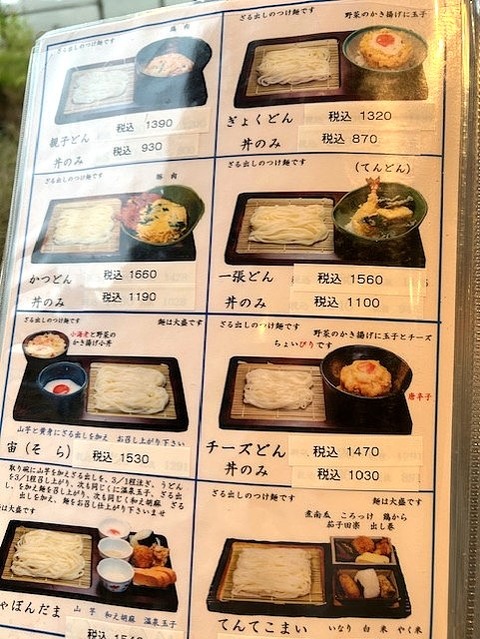 こちらは、ざる出しのつけ麵になっています。ざるで見ると麵の長さがわかりやすいですね。つるっといって、途中で噛み切り、喉ごしいいおうどんは、やっぱり醍醐味あります。