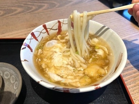 こちらも長めのうどん、ボリュームあります。小海老のてんぷらも美味しくて、卵とじにあんかけの組合せは、夏は汗をかきながら、冬はお腹の中から温まり、季節を問わずに楽しめるメニューです。