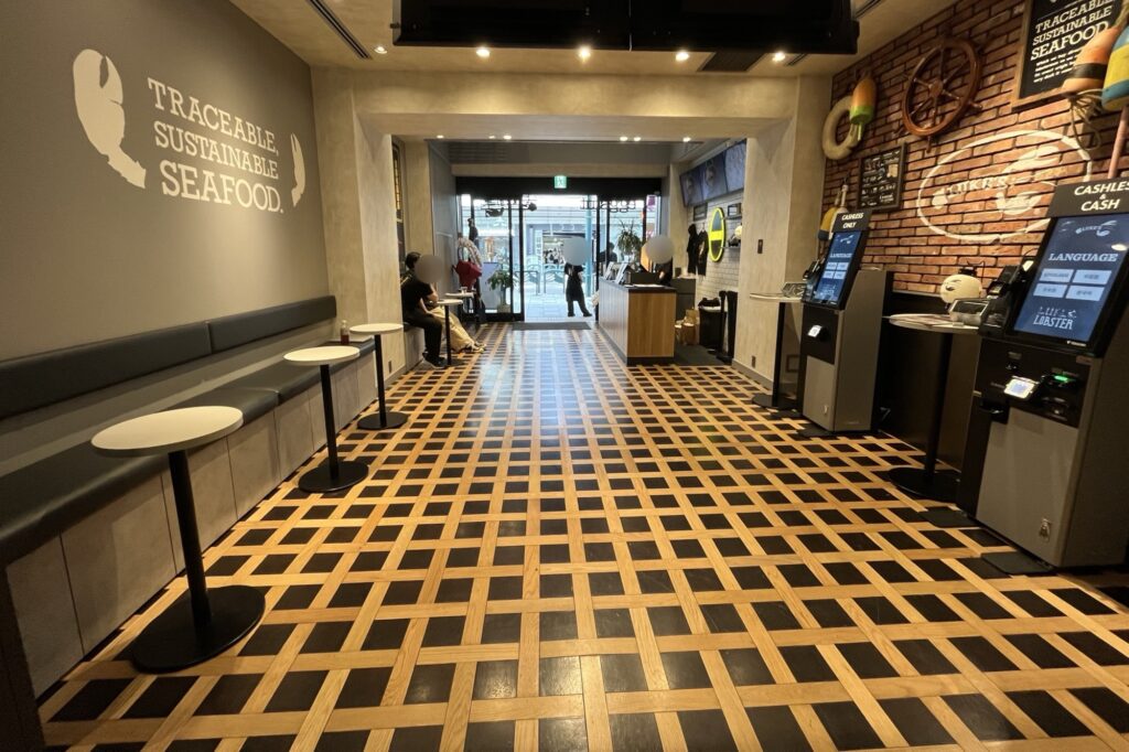 1階は注文カウンターとテイクアウトの受取専門のフロアです。 床には組み木のように組み合わさった木材を幾何学的にあしらっており、個性的です。