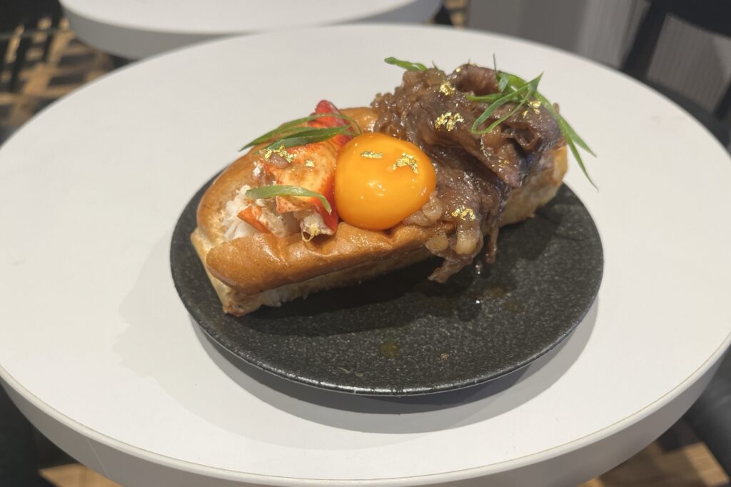 ロブスターと共に和牛すき焼きと卵黄をトッピングしたロールサンドです。すき焼きはロールパンから半分こぼれるように盛り付けてあり、時雨煮のように甘い味付けです。