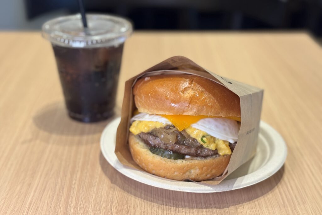 目玉焼きとスクランブルエッグが入った玉子がふんだんに使われたバーガー。柔らかくバター香る甘めのバンズと相性抜群でボリュームもしっかりあります。+440円でドリンクセットにもできます。