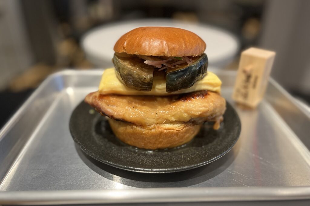 巨大なサイズのハンバーガー型のサンドで、両手でも持ち切れないほどです。パウンドケーキのようなバンズに、加茂茄子と西京味噌を使った大きな丹波あじわい鶏はしっとりした肉質。だし巻きは老舗たまご屋のだし巻きに匹敵するクオリティです。黒七味で味変します。