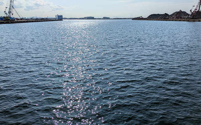 海を見ると潮も動いておらず、ゴミ溜まりになっていました。水面にはボラが群れで泳いでおり、エイもたくさん見えます。隣のサビキ釣りの方は「アイゴしか釣れない」と言っておられ、回遊魚は入ってきていない状態でした。ここでしばらく観察していましたが、サヨリの姿はありませんでした。そこで隣の埠頭へ移動しました。