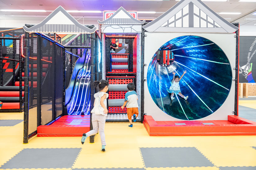 同店の特長は、503坪という広々とした店内に併設された子ども向けの大型屋内アスレチックパーク。「忍びの訓練」をイメージしており、「渡る、跳ぶ、ぶら下がる」などの障害物をクリアするタイプのアトラクションやスライダー、周回コースを回る電動カートのアトラクションなど、天候に左右されず、子どもが元気いっぱい体を動かせます。ゲームセンターは入場無料。