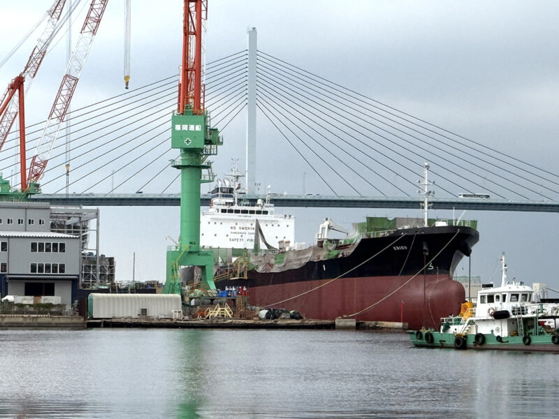 岸壁からは都市高速の荒津大橋と、福岡造船に停泊している巨大な船が織りなす素晴らしい景色も楽しめますよ!