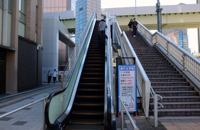 信号を待たずとも通行できるのに加え、階段やエスカレーターのほかにエレベーターがあり、ベビーカーなどでも通行しやすい通路です。デッキの通行止めに伴い、こちらのエスカレーターも利用停止となるようです。