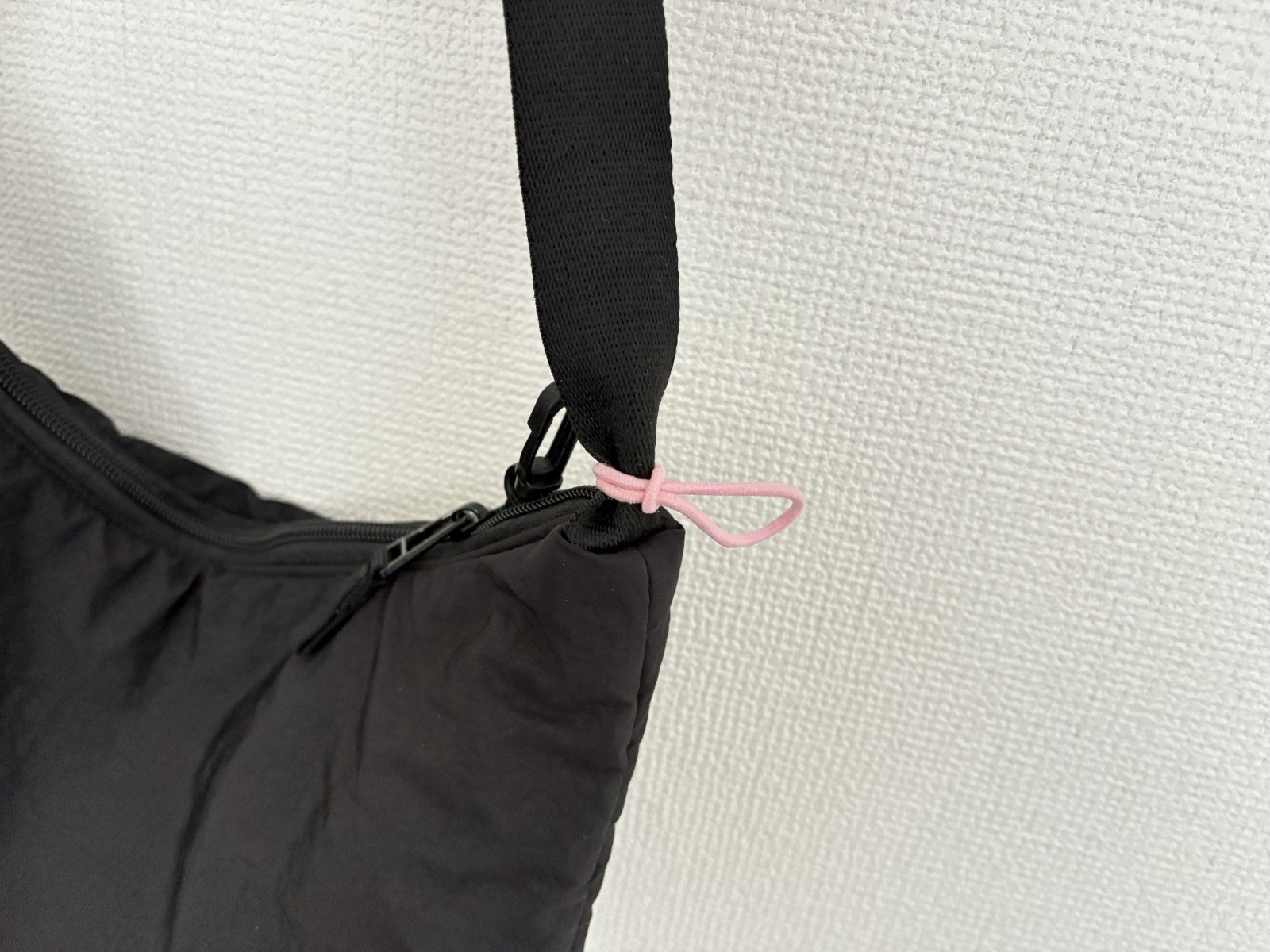 ヘアゴムをバッグの持ち手やショルダー部分に通し、画像のように輪っか状にしておきます。ゴムは少し強めに結んでおくと安定します。