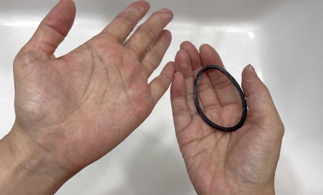 手に泡石けんをのせ、ヘアゴムで汚れた部分を“軽く”くるくるとこする だけ。