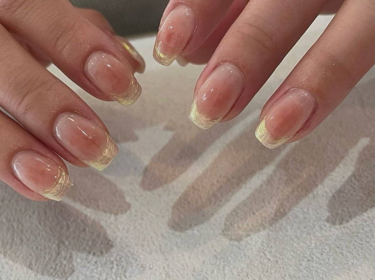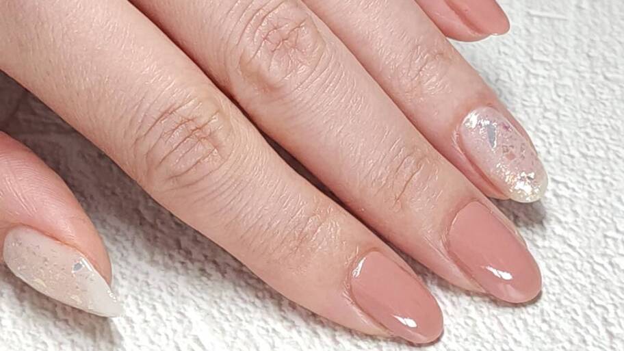 ちゅるんとしたクリアカラーをベースに、くすみベージュのフレンチネイルをプラス!