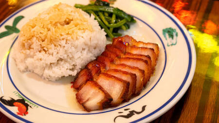 大きくカットされた煮豚がご飯の横に添えられ、見るからに存在感があります。一般的な角煮を思わせる見た目ですが、実際に口へ運んでみると印象は大きく変わります。