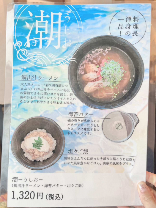 「潮(うしお)-鯛出汁ラーメンセット」は、11月は金曜日・土日祝の週末限定メニューですが、12月からは毎日注文可能になるとのこと。
