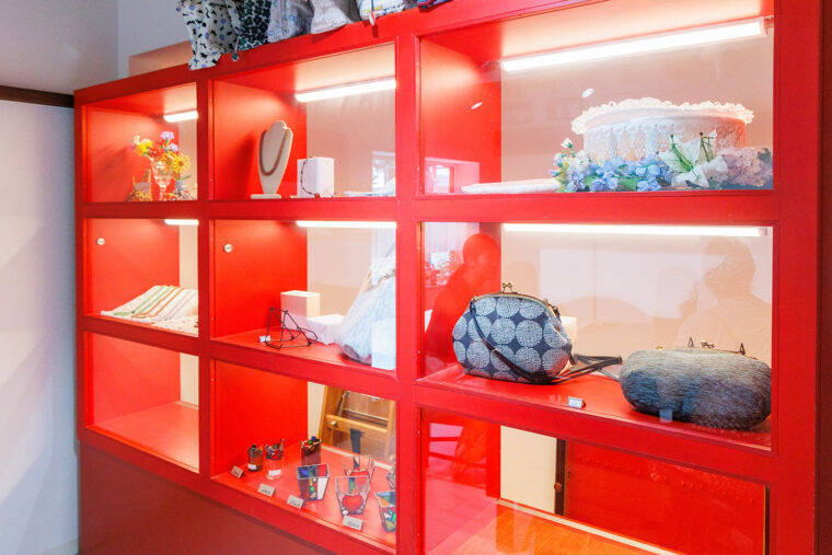 表具店の職人で手芸の先生でもある店主・雅楽静代さんが切り盛りしており、店内には作品を展示販売する真っ赤なショーケースが設置されています。