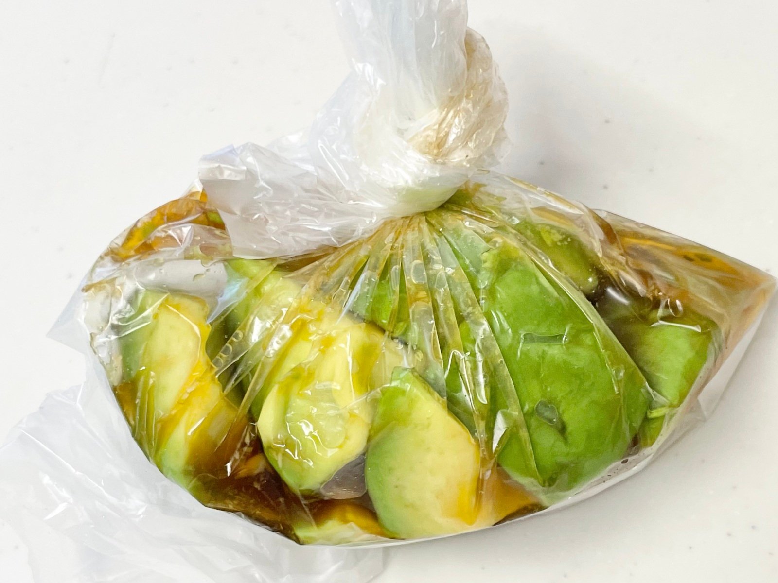 1.ポリ袋にアボカドとめんつゆを入れて数分置きます。