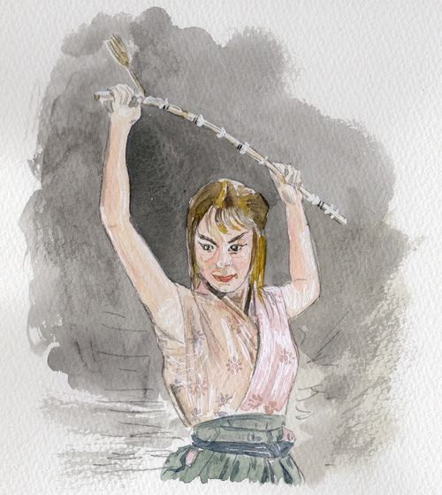 ▲野武士の山塞で悲壮な最期を遂げる『七人の侍』の島崎雪子 イラスト:Produce any Colour TaIZ/岡本和泉