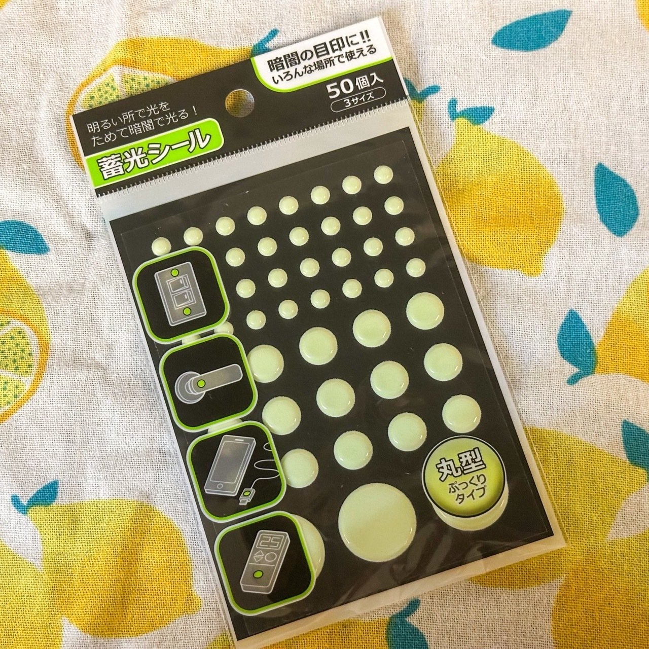 セリアやダイソーで販売されていて、貼っておくだけで暗闇でほんのり光る目印になります。