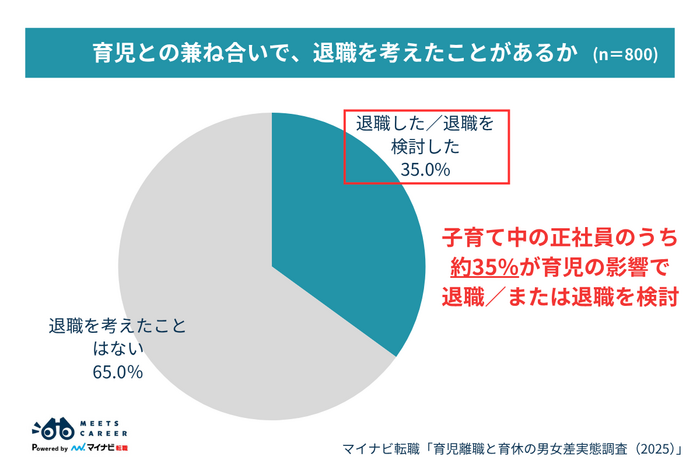 実際、マイナビ転職が行った「育児離職と育休の男女差実態調査(2025)*1」では、子育て中の正社員のうち、育児との兼ね合いで退職したり退職を検討したりした人は35%という結果が出ています。