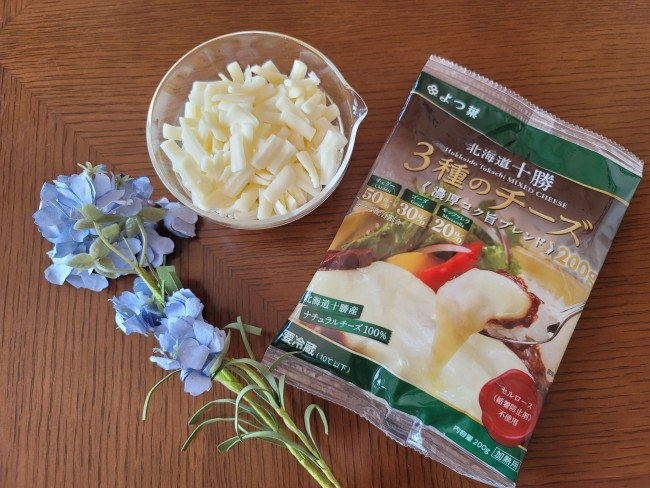 今回は、スーパーなどでも気軽に買うことができる『よつ葉北海道十勝 3種のチーズ濃厚コク旨ブレンド』を使用します。十勝産100%のナチュラルチーズで、本来の自然な風味を楽しむことができますよ。
