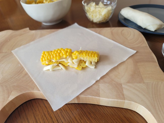 (2)春巻きの皮をひし型になるように置き、真ん中より少し手前にとうもろこしとチーズを乗せて巻き、水溶き小麦粉を塗って留めます。
