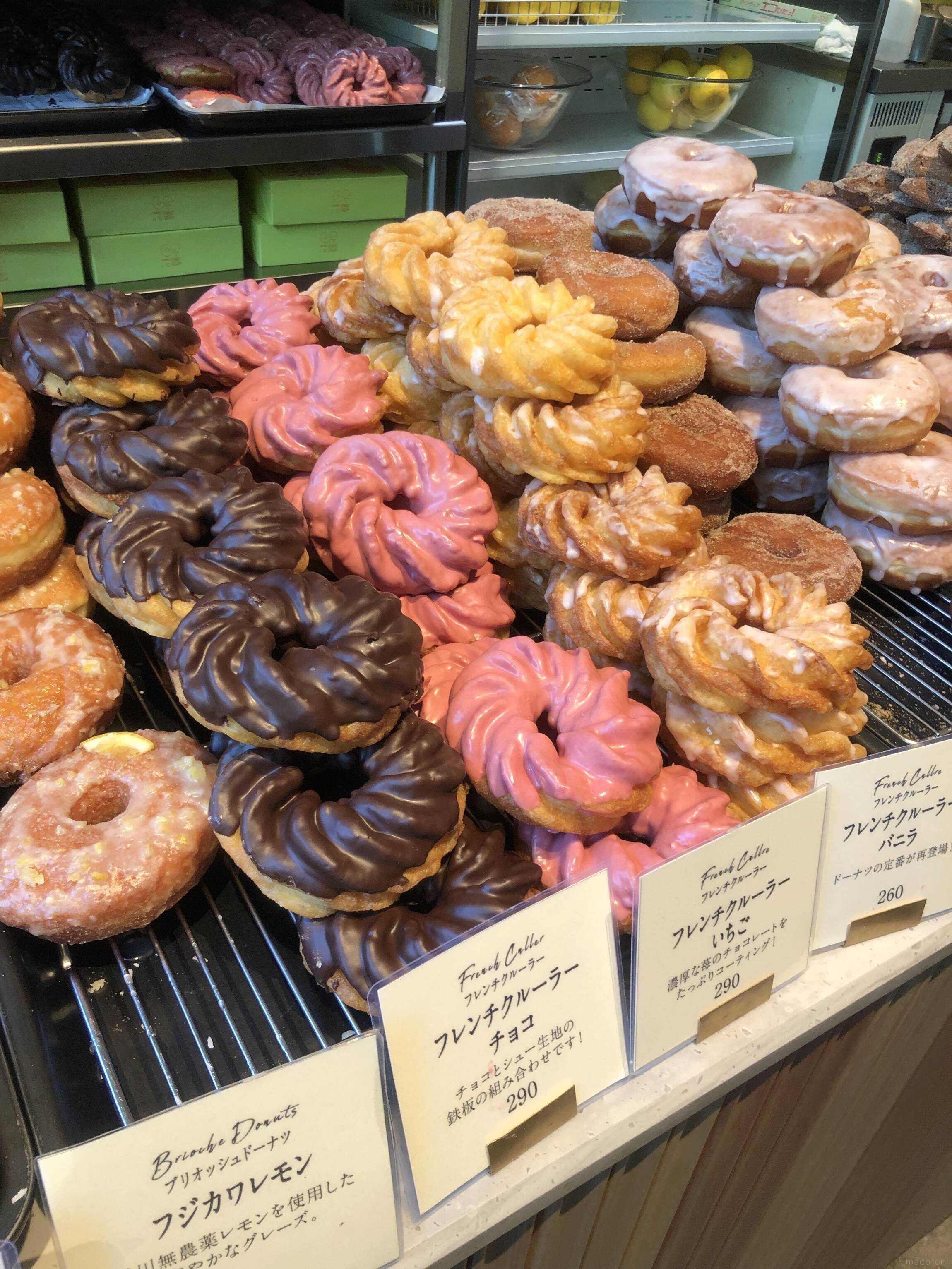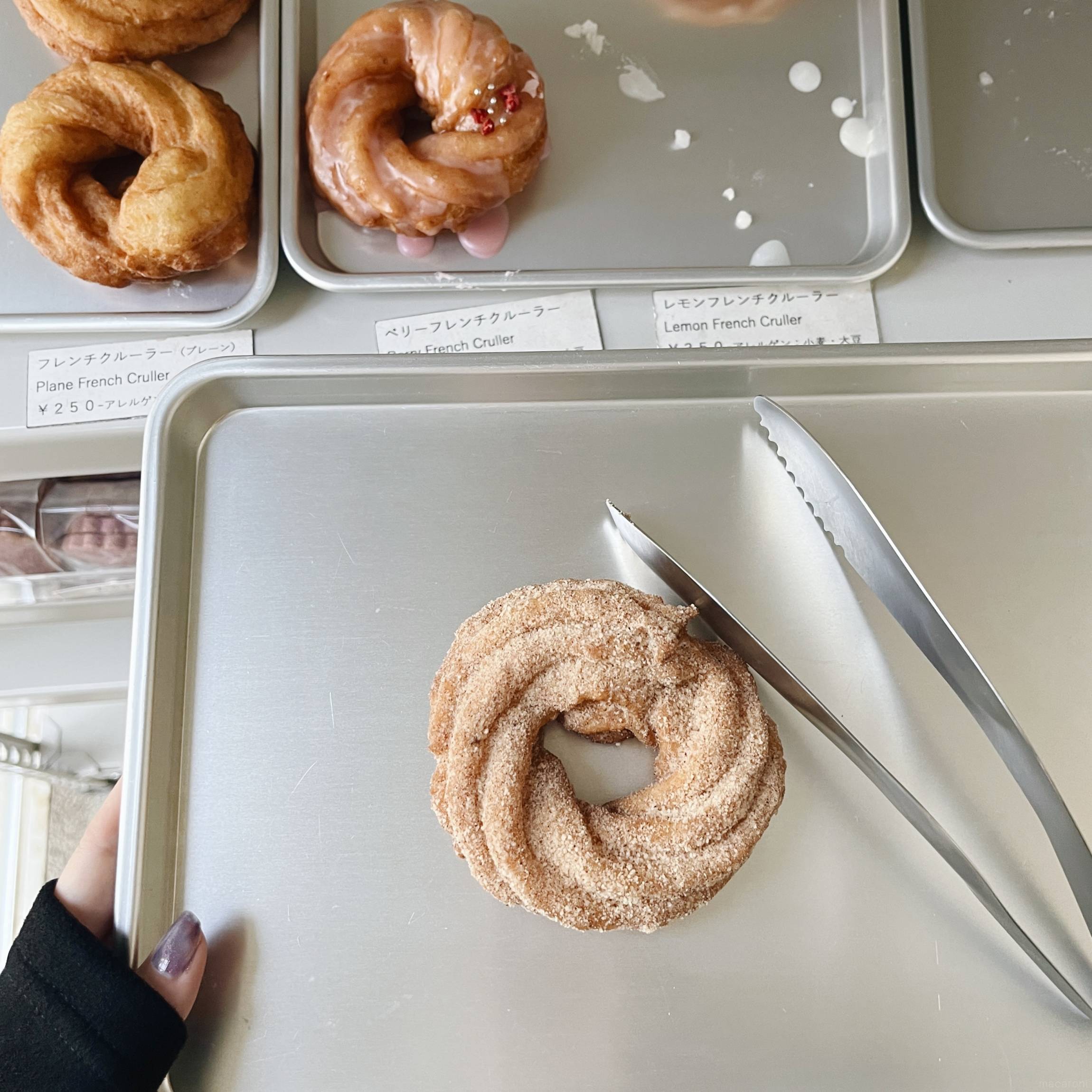 ドーナツは、種類豊富な「フレンチクルーラー」がおすすめ!プレーンに加え、ベリーやレモン、シナモンなど、さまざまなフレーバーのフレンチクルーラーが並んでいます。ふわっと軽い食感はぺろりと食べられてしまいますよ。
