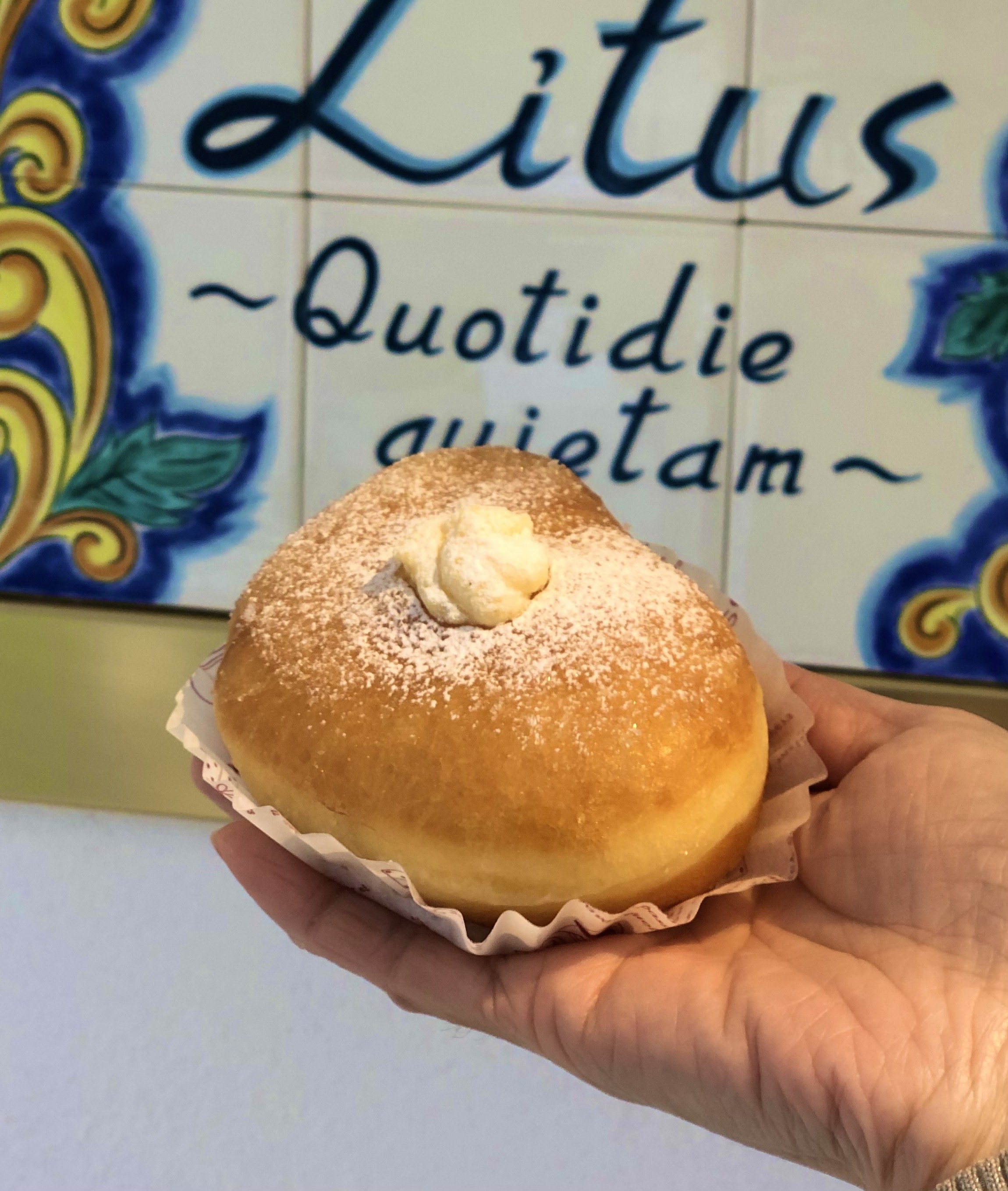 「ボンボローニ」はおやつというより朝ごはんとして定番のメニューなんだそう。オーダーしてからカスタードクリームを詰めてくれるのでふわふわサクサクの生地と、とろーり濃厚なクリームが楽しめます。