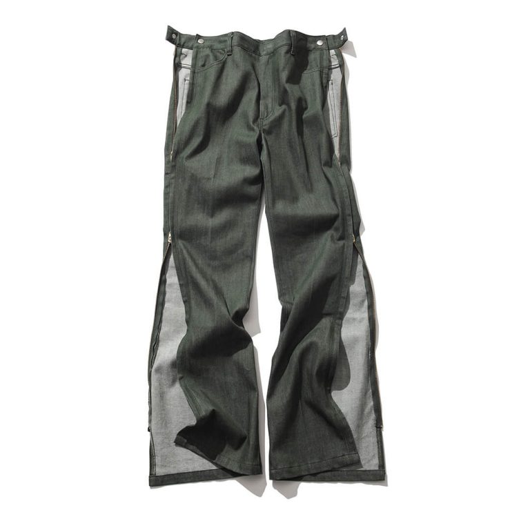 ハイリジットジーンズといえばパリパリしていて形もクラシックなものが多くて色味として欲しかったけどでもその硬さが個人的にとっつきづらい…と思っていた矢先に出会ったのがこの〈トーガ プルラ(TOGA PULLA)〉のジーンズ。裾から腰にかけてずっとサイドにジップがついていて、どこまでも開いちゃうよ! なんてフェティシュな。実際にここまで全開きでは着ないけど、膝下まで開けてソックスちら見えで遊んだり、全閉めでフレアパンツっぽくたのしんだり。いろいろできてあつい!