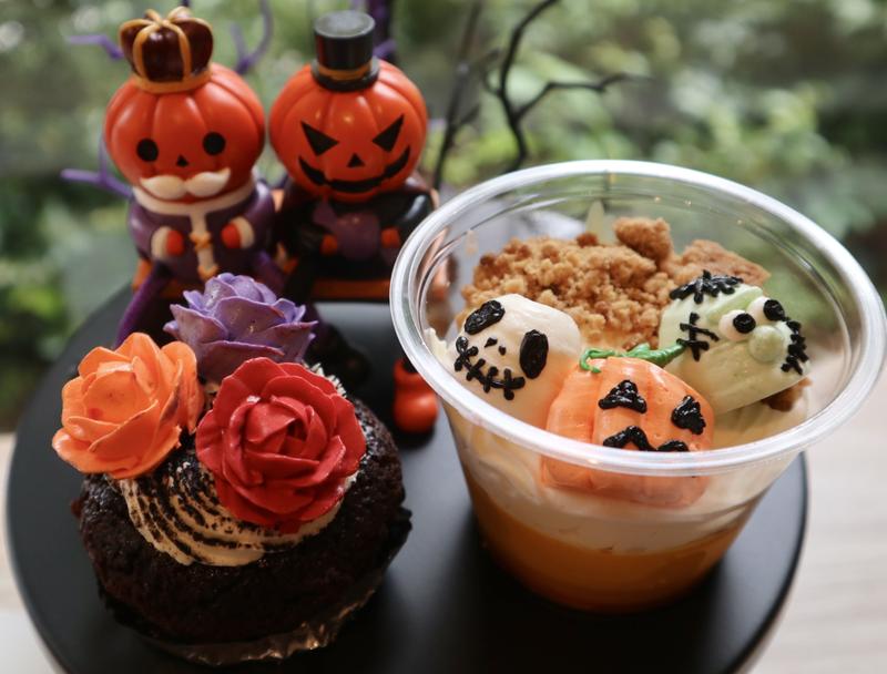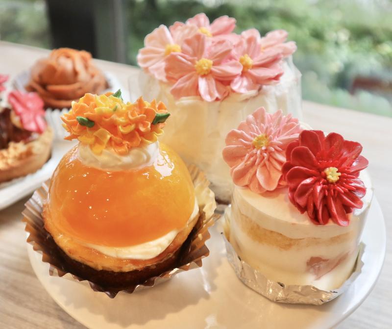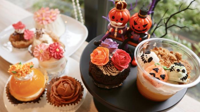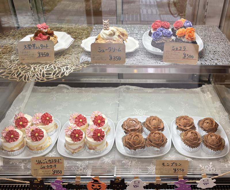 この日は秋のお花やハロウィンのデザインが並び、金木犀やコスモスもリアルで美しい仕上がり。ショートケーキやタルト、シフォンケーキなどさまざまな種類があり、見ているだけでワクワクします。