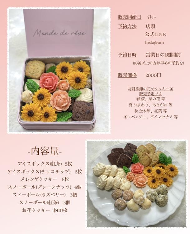 7月から販売が始まったクッキー缶には、モンドドゥレヴらしいお花のクッキーがぎっしり。プレゼントにぴったり!蓋を開けた瞬間、相手の驚く顔、笑顔が浮かびます。季節によってお花が変わるので、直接お問い合せください。※要予約