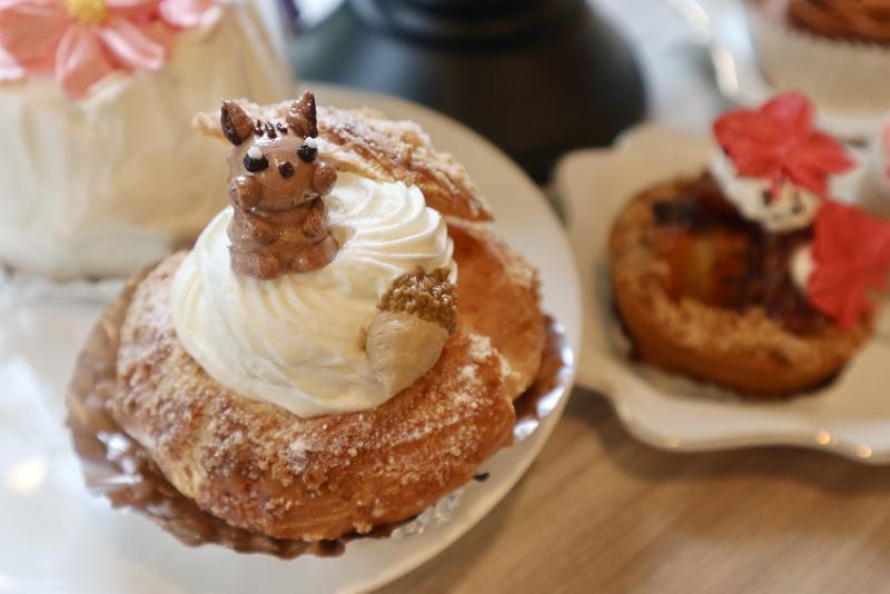 リスとドングリをデコレーションした秋のシュークリーム。リスがとっても可愛くて、本当に食べるのを躊躇してしまう…。シュークリームは生地は配合を変え、リニューアル!以前より大きくなってザクザク感もアップ!と、常においしさも追求し続けています。