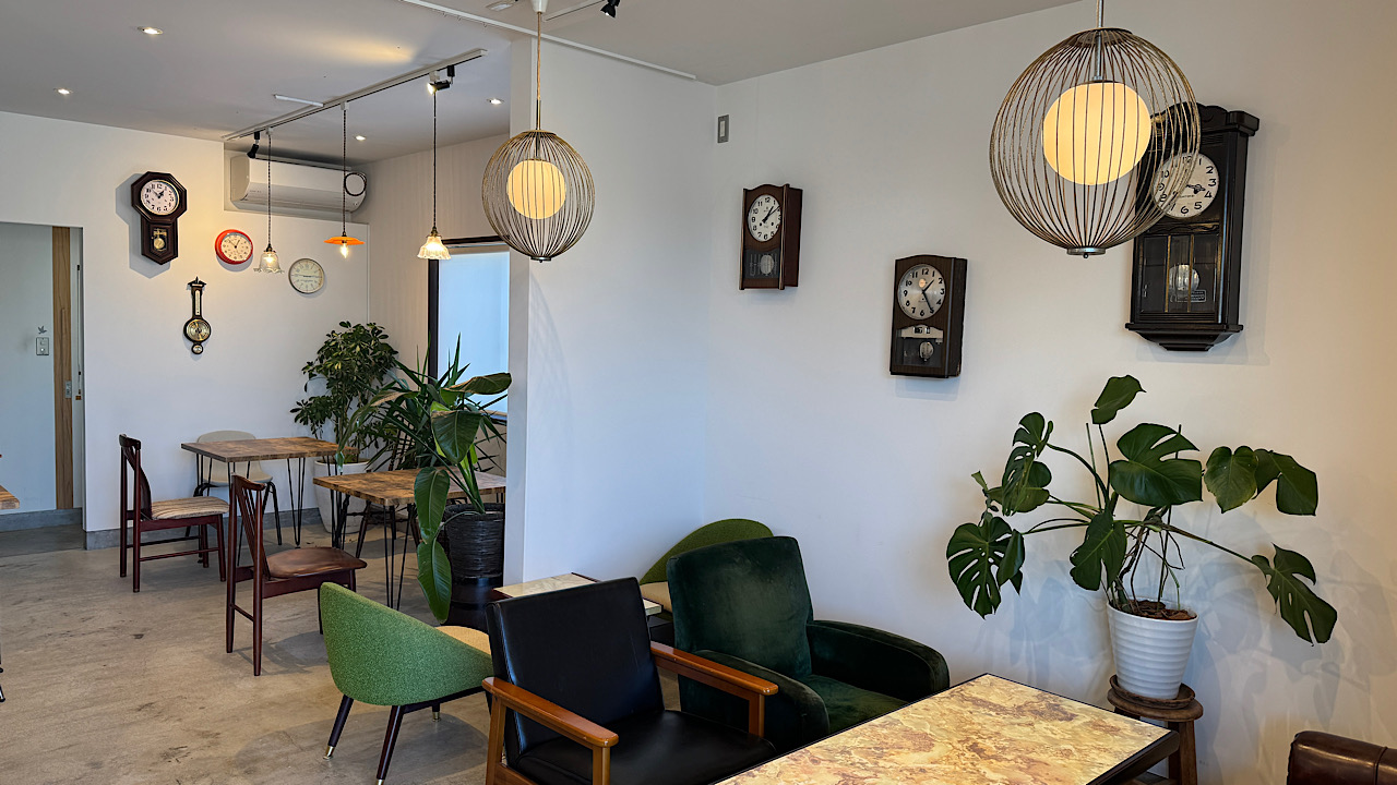 店内には古道具ショップなどから迎え入れたレトロな家具が並びます。壁にはたくさんの時計が掛かっていて、中にはまったく動いていないものもちらほら…。
