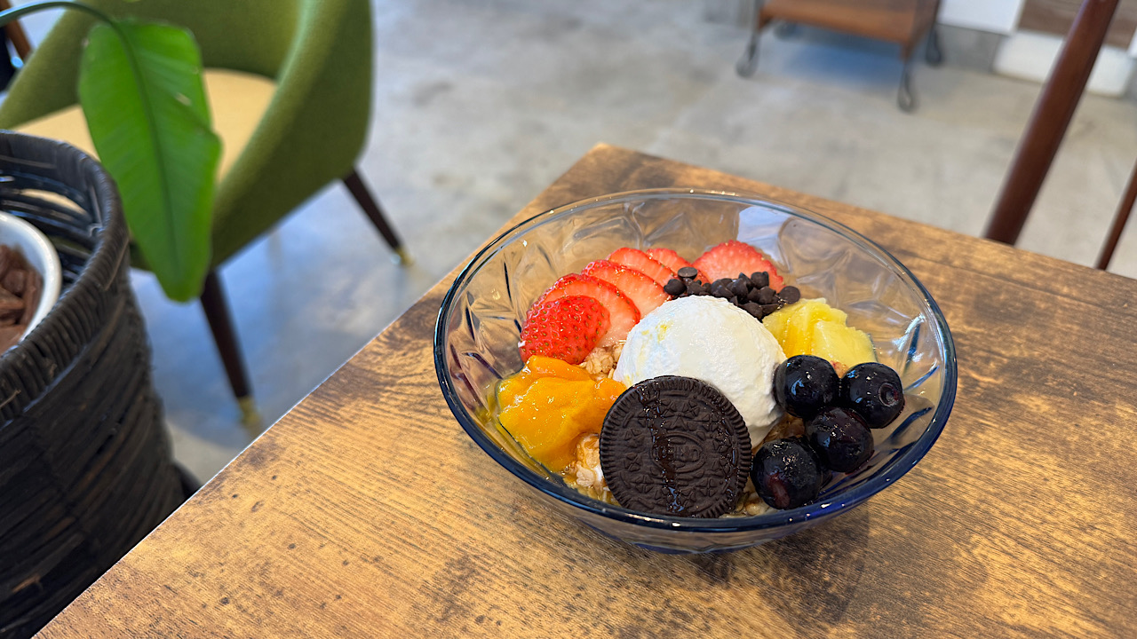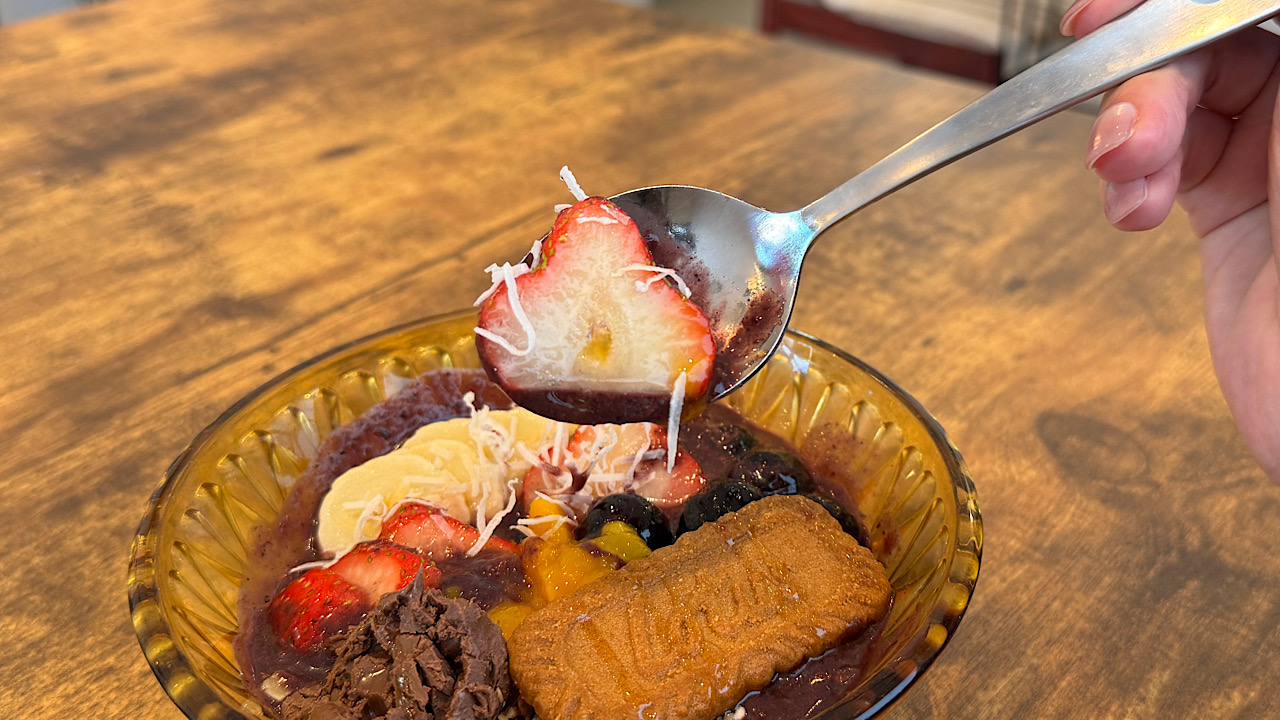 ジェラートのようにもったりとしたアサイーは濃密な味わい。冷凍のアサイーに、バナナ、ブルーベリー、ハチミツ、ほんの少しのフルグラをブレンドしているそうで、フルーティーで食べやすい甘さです。