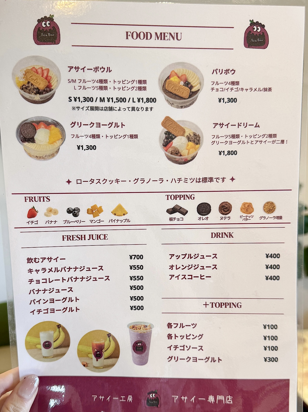 アサイーボウルはサイズが3つあって、アサイーのベースの量が変わります。Sサイズが120g、Mサイズは150g、Lサイズが180gです。