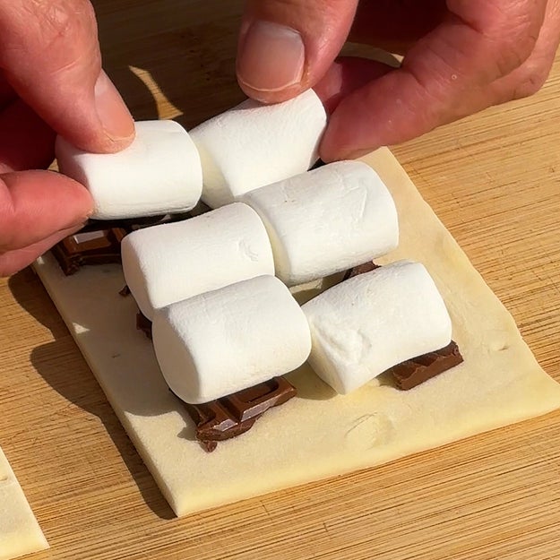 ① 冷凍パイシートが扱いやすいやわらかさになったら半分に切る。片方にマシュマロと割った板チョコをのせ、もう1枚をかぶせて周囲をフォークでしっかり押さえる。