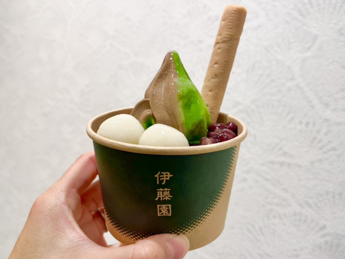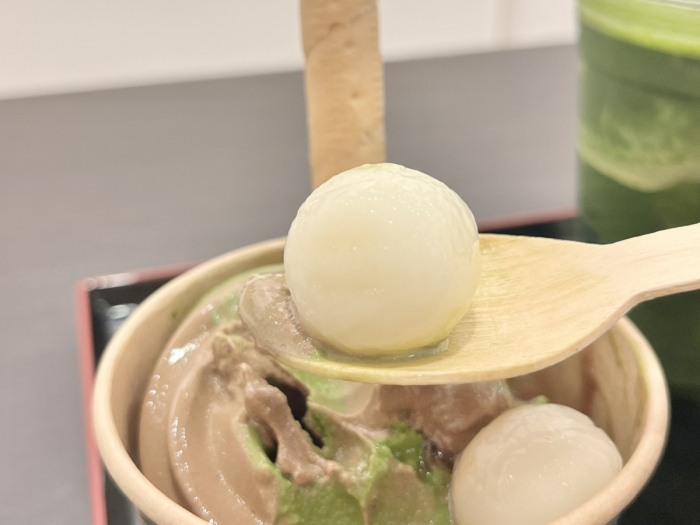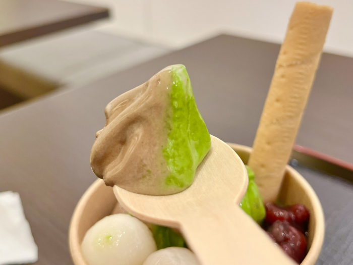 次にいただいたのは、「白玉あずきソフトクリーム」。ソフトクリームは抹茶、ほうじ茶、ミックスの中から選べるので、今回は迷わず抹茶とほうじ茶のミックスをチョイスしました。