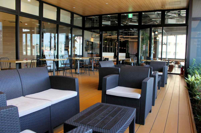 観葉植物がリゾート気分を演出し、昼は読書や打ち合わせを楽しむ大人たちの姿が、夜は学生や会社帰りの人たちがリラックスした時間を過ごしています。