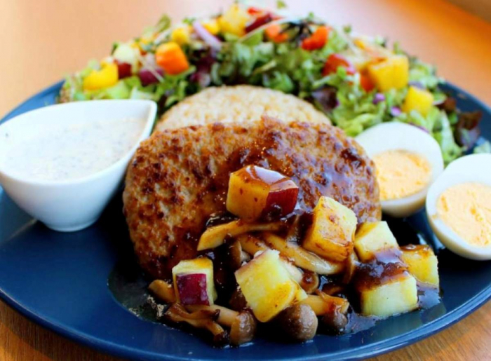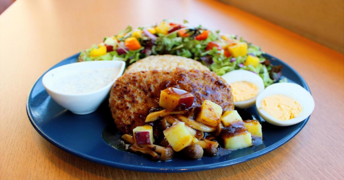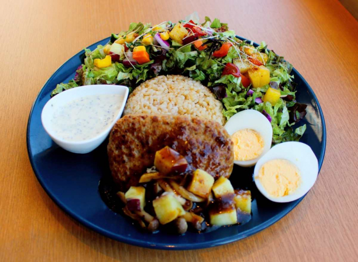 秋の新作として登場した「きのことさつまいものハンバーグ」は、玄米・サラダ・ボイルドエッグに、ジューシーなハンバーグがのった贅沢な一皿。
