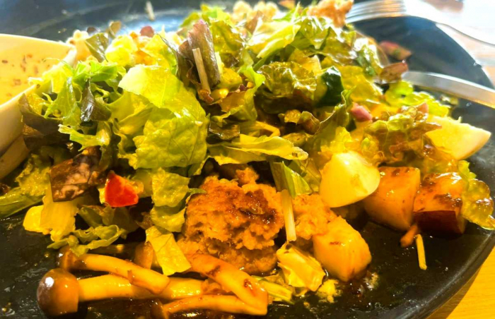 ゴロっとしたさつまいもと、きのこがたっぷり入った和風あんがかかり、秋の味わいを感じさせるコクのある一品です。また、サラダは10種類から選べるドレッシングで、毎回違った表情を楽しめます。