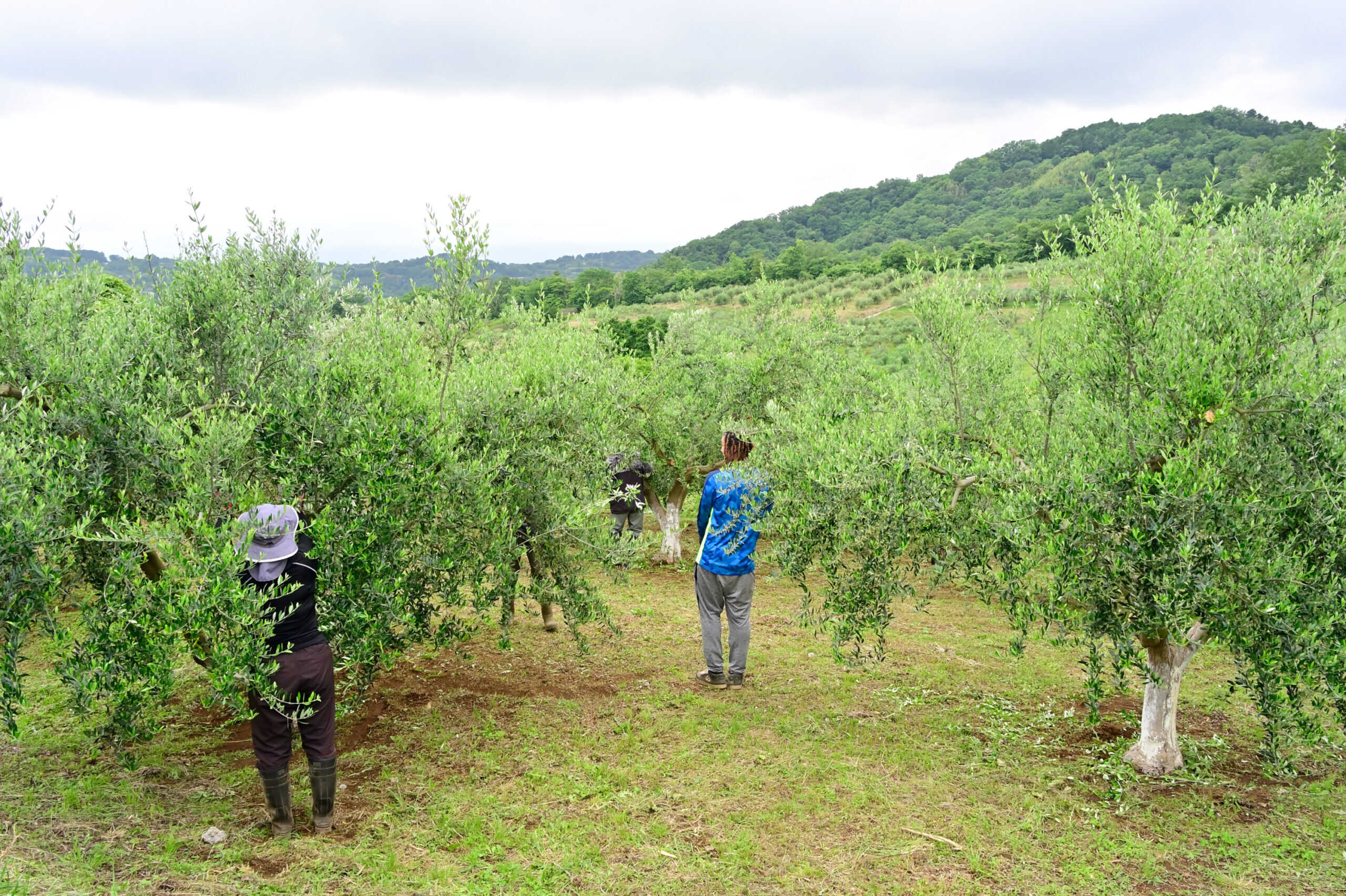 春には「根かき」という作業を行い、オリーブの木の周りの雑草を取り除き、オリーブゾウムシが住みにくく、肥料が染み込みやすい環境をつくる。