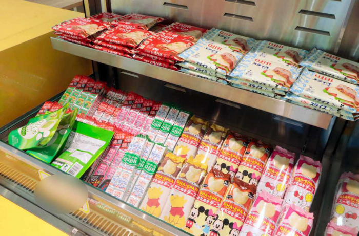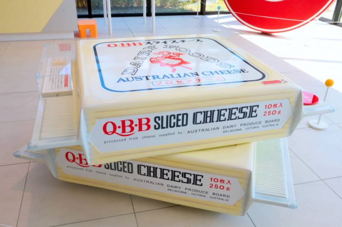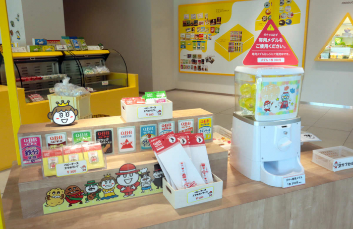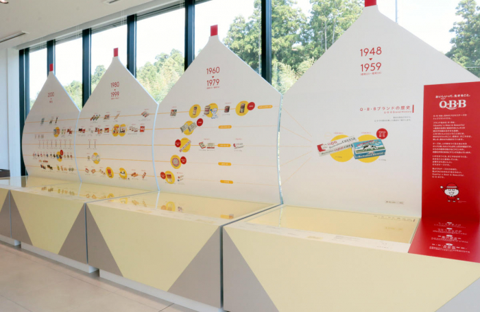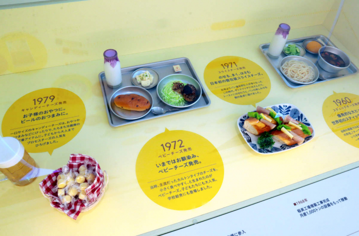 ベビーチーズの形をした展示では、六甲バターの歴史を紹介。年表に合わせてこれまで販売されてきた商品が紹介されているほか、給食や食卓に並んできた歴史が食品サンプルと共に展示されています。